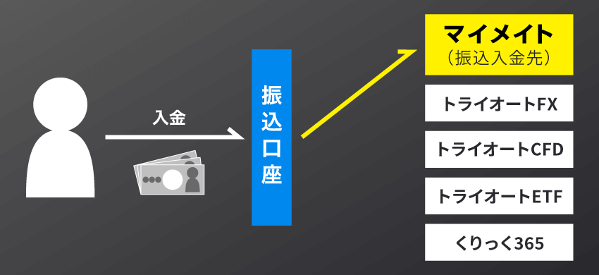 例えば、振込入金先が「マイメイト」の場合、振込口座へのご入金はマイメイト口座に入金されます。