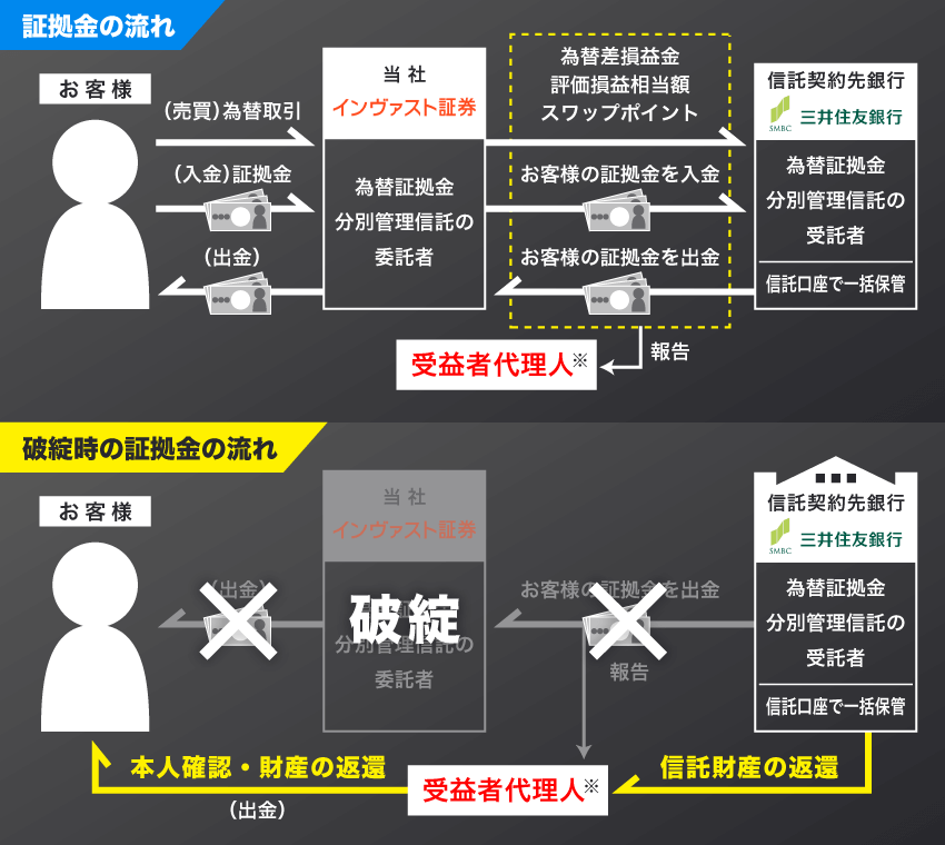 当社では、取引当日の取引終了時(※1)のお客様の有効証拠金を上回る金額を、翌々銀行営業日付で、信託契約先銀行に送金して分離保管いたします。