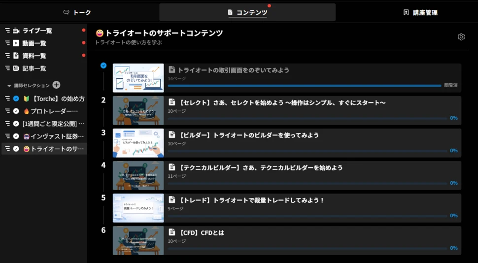 ライブ・動画・資料・ブログ・トークなど全ての教材をこの中で視聴することができます。